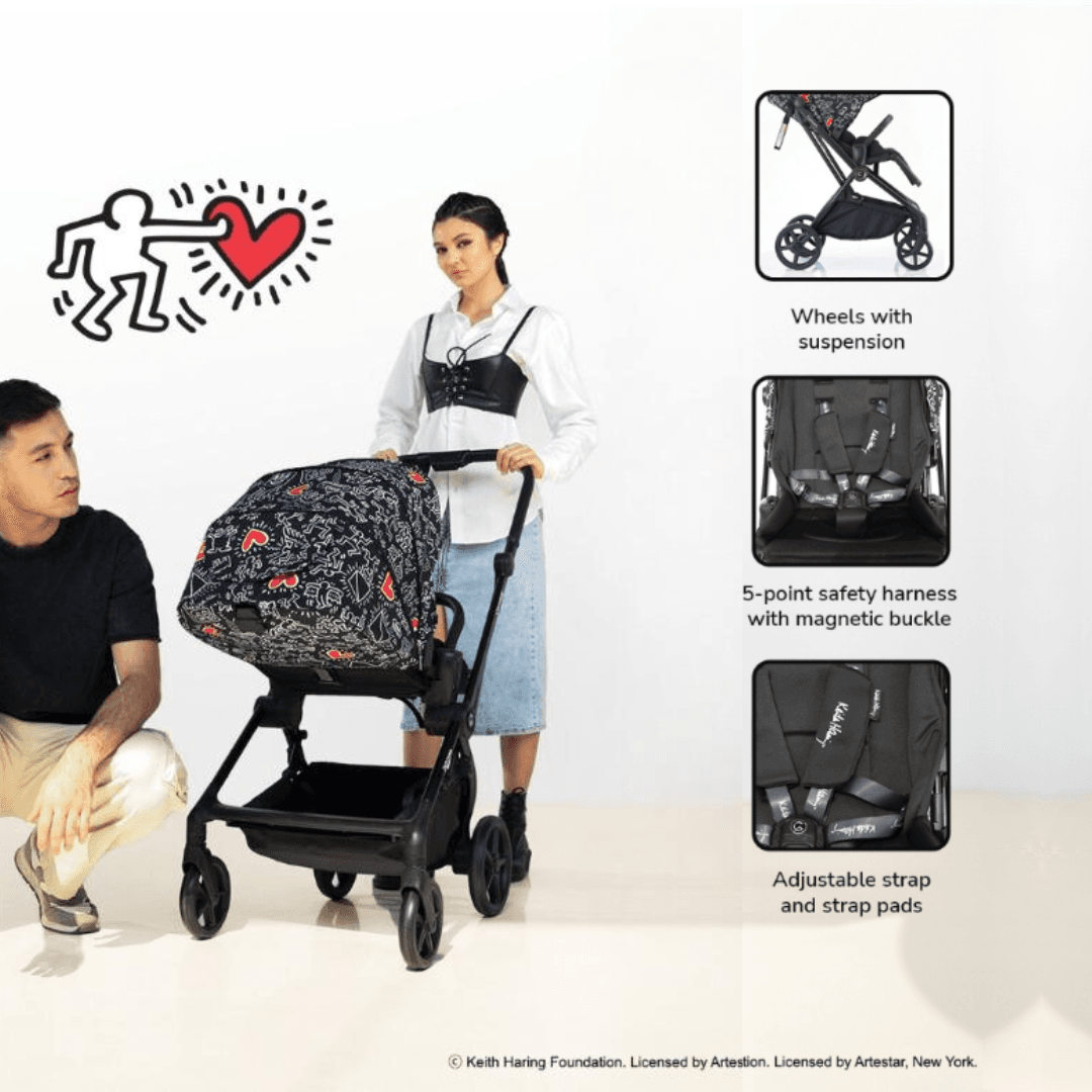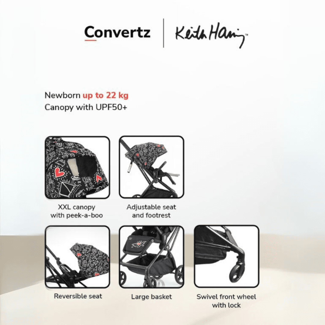 COCOLATTE | Keith Haring Convertz Black Stroller adalah stroller modern dan stylish karena telah dirancang menggunakan aksen corak khas dari keith haring. Stroller ini cocok untuk bayi baru lahir hingga 22 kg, dilengkapi dengan atap XXL, kursi yang dapat diatur dan sandaran kaki, kursi yang dapat dibalik, keranjang besar, roda dengan suspensi, roda depan yang dapat diputar dengan rem, rem, bumper bar yang dapat dilepas, atap dengan UPF50+, gesper magnetik, dan sabuk pengaman 5 titik.